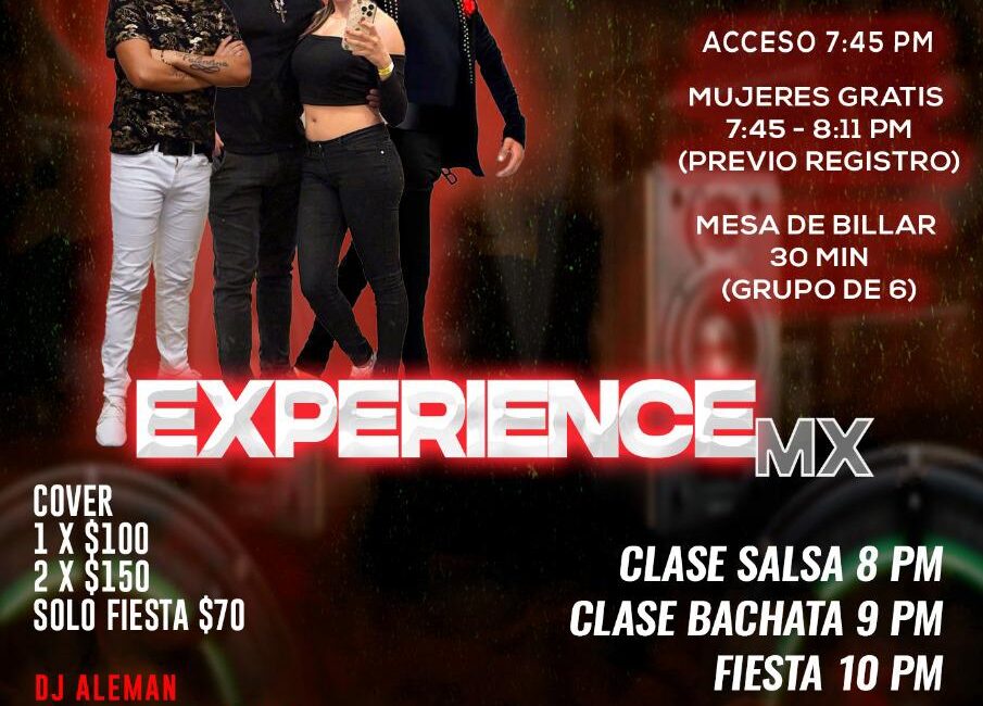experience mx POOL SPOT 22 Agosto Heeey están listos para nuestra siguiente edición de Experience MX. Producciones Tecmukba los invita este jueves con clase de Salsa y bachata para que todos aprendamos!!!... Y la mejor selección de su amigo DJ Johnny Musysx y DJ Aleman durante toda la...